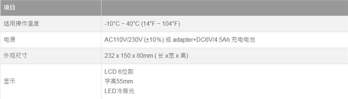 加大型LCD顯示屏幕(175x70mm, 6位數, 字高55mm), 具有冷色背光。